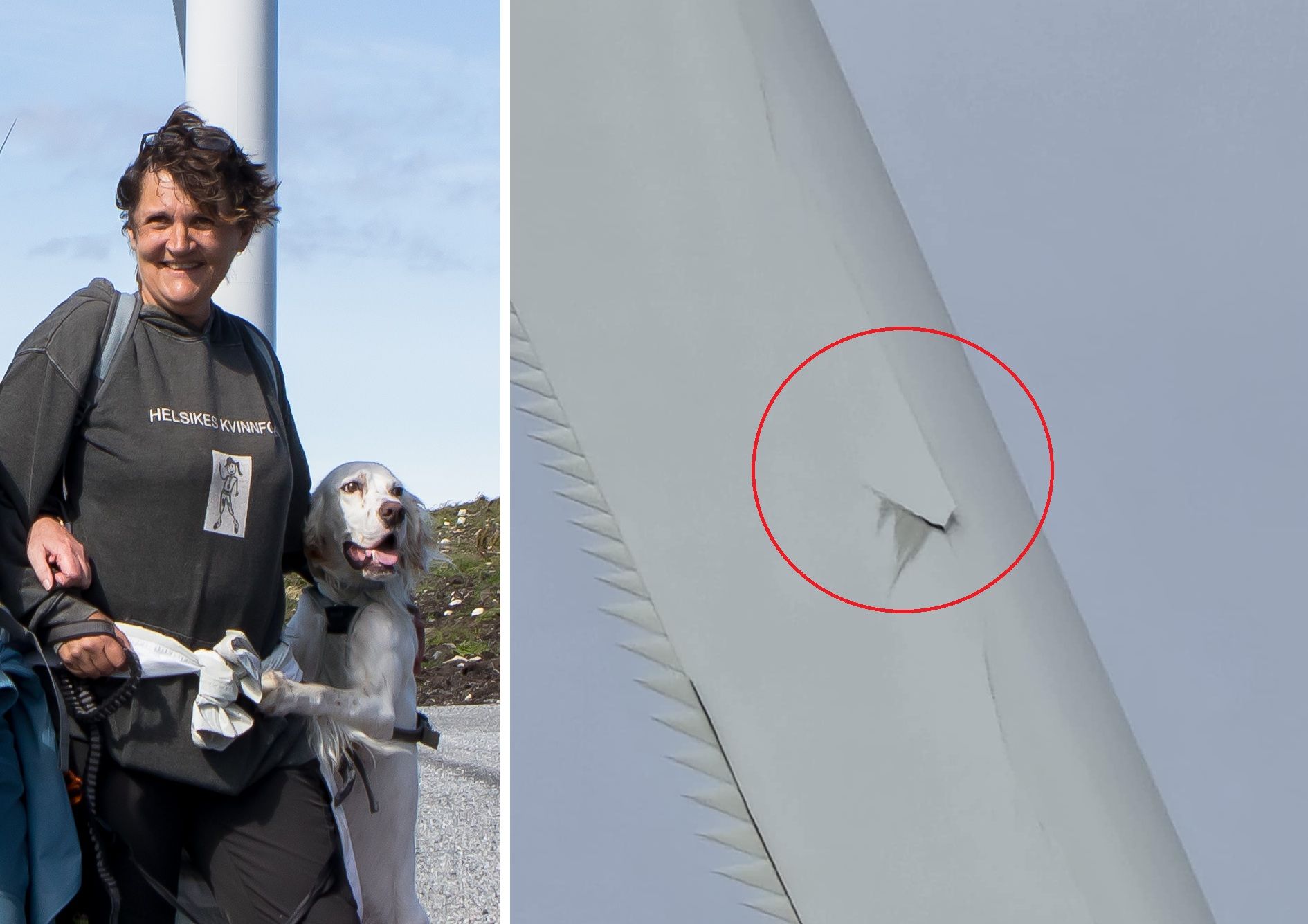 Det ser ut som at alle tre rotorblada har begynt å sprekke opp, fortel Anne Grete Johnsen. Foto: Anne Grete Johnsen